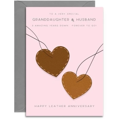 GRANDDAUGHTER & HUSBAND 3 YEAR ANNIVERSARY CARD ⭐ Leather Hearts Design ⭐ Click the second image for the text inside the card. EXTRA THICK CARDSTOCK ⭐ 330gsm triple coated cardstock with a lovely matt inside surface for ease of writing SIZE ⭐This anniversary card measure 148 x 210mm (A5 Size) and comes with a 162 x 229mm Grey envelope UK MANUFACTURED ⭐ A small family business. Professionally printed in our Hampshire factory ECO FRIENDLY ⭐ Our factory runs on 100% renewable energy. Our cardstock is sustainably sourced. Both the card and envelope are fully recyclable.