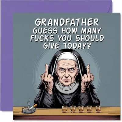 MAKE YOUR GRANDFATHER SMILE WITH THIS UNIQUE BIRTHDAY CARD: This exceptional quality Grandfather birthday card shows the design 'Grandfather Guess how many fucks you should give today? Nun'. If you are looking for an awesome birthday card for Grandfather, then then this happy birthday Grandfather card is bound to make them smile. Not just a birthday card for Grandfather this could also be a birthday gifts for Grandfather, Grandad or Grandpa. WHAT DO YOU GET: The card is printed on one side and BLANK ON THE INSIDE to allow you to write your very own message. The unique fun design is printed on a specially sourced and environmentally responsible board. At 360 microns thick the natural white one-sided gloss board has a quality look and feel. Supplied with a coloured gummed envelope to complement the design and ready to be sealed and sent in the post. Great Grandfather birthday cards, Grandad birthday card. NO INK SMUDGES: There is nothing worse than writing inside a card to find that the shiny surface makes the ink smudge. This is why we use a high quality one sided coated board. The uncoated side will absorb more of the ink from your pen to make smudging a thing of the past. Grandfather birthday cards, Grandfather birthday cards from Grandson. SIZES: Greeting Card = 145mm x 145mm, Envelope = 155mm x 155mm, Card Thickness = 360 micron. Happy birthday Grandfather, Grandfathers birthday card, Grandfather cards birthday, birthday card Grandfather, happy birthday Grandfather card, Grandfather gifts from Grandson. MADE AND QUALITY CHECKED IN THE UK: We print and manufacture all our products right here in the UK so you can be sure of a fast turnaround and a product that is expertly made. Using environmentally responsible premium board our card is conscious of the responsible management of the world's forests - happy birthday card Grandfather, Grandfather birthday cards.
