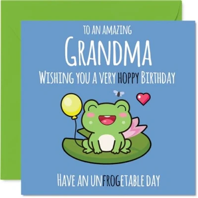 MAKE YOUR GRANDMA SMILE WITH THIS UNIQUE BIRTHDAY CARD: This exceptional quality Grandma birthday card shows the design 'To an amazing Grandma Wishing you a very hoppy birthday. Have an unfrogetable day'. If you are looking for a beautiful birthday card Grandma, then then this happy birthday Grandma card is bound to make them smile. Not just a birthday card for Grandma this could also be a birthday gifts for Grandma, Gran or Grandmother. WHAT DO YOU GET: The card is printed on one side and BLANK ON THE INSIDE to allow you to write your very own message. The unique fun design is printed on a specially sourced and environmentally responsible board. At 360 microns thick the natural white one-sided gloss board has a quality look and feel. Supplied with a coloured gummed envelope to complement the design and ready to be sealed and sent in the post. Grandma Mothers Day cards, Gran birthday cards, Grandmother birthday card. NO INK SMUDGES: There is nothing worse than writing inside a card to find that the shiny surface makes the ink smudge. This is why we use a high quality one sided coated board. The uncoated side will absorb more of the ink from your pen to make smudging a thing of the past. Grandma birthday cards, Grandma birthday cards from Grandson. SIZES: Greeting Card = 145mm x 145mm, Envelope = 155mm x 155mm, Card Thickness = 360 micron. Happy birthday Grandma, Grandmas birthday card, Grandma cards birthday, birthday card Grandma, happy birthday Grandma card, Grandma gifts from Grandson. MADE AND QUALITY CHECKED IN THE UK: We print and manufacture all our products right here in the UK so you can be sure of a fast turnaround and a product that is expertly made. Using environmentally responsible premium board our card is conscious of the responsible management of the world's forests - happy birthday card Grandma, Grandma birthday cards.