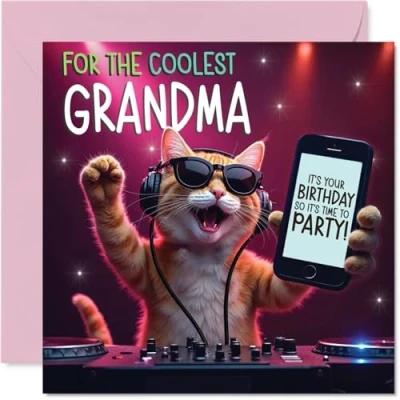 Grandma Birthday Card Party DJ cat Happy for from Grandson Granddaughter, 145mm deejay Bday Greeting Cards