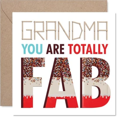 MAKE YOUR GRANDMA SMILE WITH THIS UNIQUE BIRTHDAY CARD: This exceptional quality Grandma birthday card for her shows the design ''Grandma You are totally FAB''. If you are looking for a beautiful birthday card Grandma for her, then then this happy birthday Grandma card is bound to make her smile. Not just a birthday card for Grandma this could also be a birthday gifts for Grandma, Gran or Grandmother. WHAT DO YOU GET: The cards are printed on both sides with the inside print showing a Sprinkle Design' and ample space for your own personal message. The unique fun design is printed on a specially sourced and environmentally responsible board. At 360 microns thick the natural white one-sided gloss board has a quality look and feel. Supplied with a coloured gummed envelope to complement the design and ready to be sealed and sent in the post. NO INK SMUDGES: There is nothing worse than writing inside a card to find that the shiny surface makes the ink smudge. This is why we use a high quality one sided coated board. The uncoated side will absorb more of the ink from your pen to make smudging a thing of the past. Grandma birthday cards, Grandma birthday cards from Grandson. SIZES: Greeting Card = 145mm x 145mm, Envelope = 155mm x 155mm, Card Thickness = 360 micron. Happy birthday Grandma, Grandmas birthday card, Grandma cards birthday, birthday card Grandma, happy birthday Grandma card, Grandma gifts from Grandson. MADE AND QUALITY CHECKED IN THE UK: We print and manufacture all our products right here in the UK so you can be sure of a fast turnaround and a product that is expertly made. Using environmentally responsible premium board our card is conscious of the responsible management of the world''s forests - happy birthday card Grandma, Grandma birthday cards.