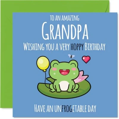 MAKE YOUR GRANDPA SMILE WITH THIS UNIQUE BIRTHDAY CARD: This exceptional quality Grandpa birthday card shows the design 'To an amazing Grandpa Wishing you a very hoppy birthday. Have an unfrogetable day'. If you are looking for a beautiful birthday card Grandpa, then then this happy birthday Grandpa card is bound to make them smile. Not just a birthday card for Grandpa this could also be a birthday gifts for Grandpa, Grandpa or Grandfather. WHAT DO YOU GET: The card is printed on one side and BLANK ON THE INSIDE to allow you to write your very own message. The unique fun design is printed on a specially sourced and environmentally responsible board. At 360 microns thick the natural white one-sided gloss board has a quality look and feel. Supplied with a coloured gummed envelope to complement the design and ready to be sealed and sent in the post. Grandpa Fathers Day cards, Grandpa birthday cards, Grandfather birthday card. NO INK SMUDGES: There is nothing worse than writing inside a card to find that the shiny surface makes the ink smudge. This is why we use a high quality one sided coated board. The uncoated side will absorb more of the ink from your pen to make smudging a thing of the past. Grandpa birthday cards, Grandpa birthday cards from Grandson. SIZES: Greeting Card = 145mm x 145mm, Envelope = 155mm x 155mm, Card Thickness = 360 micron. Happy birthday Grandpa, Grandpas birthday card, Grandpa cards birthday, birthday card Grandpa, happy birthday Grandpa card, Grandpa gifts from Grandson. MADE AND QUALITY CHECKED IN THE UK: We print and manufacture all our products right here in the UK so you can be sure of a fast turnaround and a product that is expertly made. Using environmentally responsible premium board our card is conscious of the responsible management of the world's forests - happy birthday card Grandpa, Grandpa birthday cards.