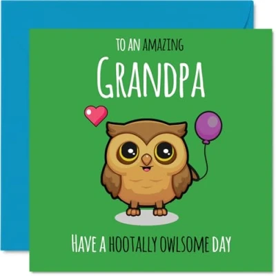 MAKE YOUR GRANDPA SMILE WITH THIS UNIQUE BIRTHDAY CARD: This exceptional quality Grandpa birthday card shows the design 'To An Amazing Grandpa Have Hootally Owlsome Day'. If you are looking for an awesome birthday card for Grandpa, then then this happy birthday Grandpa card is bound to make them smile. Not just a birthday card for Grandpa this could also be a birthday gifts for Grandpa, Grandpa or Grandfather. WHAT DO YOU GET: The card is printed on one side and BLANK ON THE INSIDE to allow you to write your very own message. The unique fun design is printed on a specially sourced and environmentally responsible board. At 360 microns thick the natural white one-sided gloss board has a quality look and feel. Supplied with a coloured gummed envelope to complement the design and ready to be sealed and sent in the post. Great Grandpa birthday cards, Grandpa birthday card. NO INK SMUDGES: There is nothing worse than writing inside a card to find that the shiny surface makes the ink smudge. This is why we use a high quality one sided coated board. The uncoated side will absorb more of the ink from your pen to make smudging a thing of the past. Grandpa birthday cards, Grandpa birthday cards from Grandson. SIZES: Greeting Card = 145mm x 145mm, Envelope = 155mm x 155mm, Card Thickness = 360 micron. Happy birthday Grandpa, Grandpas birthday card, Grandpa cards birthday, birthday card Grandpa, happy birthday Grandpa card, Grandpa gifts from Grandson. MADE AND QUALITY CHECKED IN THE UK: We print and manufacture all our products right here in the UK so you can be sure of a fast turnaround and a product that is expertly made. Using environmentally responsible premium board our card is conscious of the responsible management of the world's forests - happy birthday card Grandpa, Grandpa birthday cards.