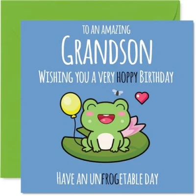MAKE YOUR GRANDSON SMILE WITH THIS UNIQUE BIRTHDAY CARD: This exceptional quality Grandson birthday card shows the design 'To an amazing Grandson Wishing you a very hoppy birthday. Have an unfrogetable day'. If you are looking for a beautiful birthday card Grandson, then then this happy birthday Grandson card is bound to make them smile. Not just a birthday card for Grandson this could also be a birthday gifts for Grandson, Great Grandson or Step Grandson. WHAT DO YOU GET: The card is printed on one side and BLANK ON THE INSIDE to allow you to write your very own message. The unique fun design is printed on a specially sourced and environmentally responsible board. At 360 microns thick the natural white one-sided gloss board has a quality look and feel. Supplied with a coloured gummed envelope to complement the design and ready to be sealed and sent in the post. Grandson Bday cards, Great Grandson birthday cards, Step Grandson birthday card. NO INK SMUDGES: There is nothing worse than writing inside a card to find that the shiny surface makes the ink smudge. This is why we use a high quality one sided coated board. The uncoated side will absorb more of the ink from your pen to make smudging a thing of the past. Grandson birthday cards, Grandson birthday cards from Grandad. SIZES: Greeting Card = 145mm x 145mm, Envelope = 155mm x 155mm, Card Thickness = 360 micron. Happy birthday Grandson, Grandsons birthday card, Grandson cards birthday, birthday card Grandson, happy birthday Grandson card, Grandson gifts from Grandad. MADE AND QUALITY CHECKED IN THE UK: We print and manufacture all our products right here in the UK so you can be sure of a fast turnaround and a product that is expertly made. Using environmentally responsible premium board our card is conscious of the responsible management of the world's forests - happy birthday card Grandson, Grandson birthday cards.