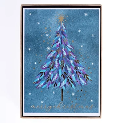 Graphique Merry Christmas Gold and Purple Tree Holiday Boxed Cards 15 Cards, Includes Matching Envelopes Storage Box, Measure 4.75 x 6.625