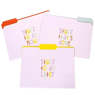 DESIGNER STYLE Say goodbye to boring manila folders by decorating your desk with this colorful and chic file set. These fashionable binders are available in an assortment of colors, patterns and phrases. Decorative office supplies is a great gift for friends, family and colleagues. STAY PRIORIZED With these binder binders, you can first focus on tackling important projects, followed by the others on your to-do list. The decorative writing on these colorful binders includes: "stuff to do now", "stuff to do later" and "stuff that's done". High quality triple folders easily expand to hold everything you need, and the thick cardstock can withstand the natural wear and tear of work, school, travel or anywhere else. The offset tabs provide easy viewing, quick identification and organization right at your fingertips. Each tab is easy to write on and the labels stick to it. SET OF 9 This pack contains 9 folders, in a choice of 3 colours with 3 different sayings. Once folded, each file folder measures 11.75" x 9.5", perfect for letter size documents. Your Stationery Boutique Graphique creates fine designer cards, calendars, notes, folders, journals and more for a stylish presentation that expresses who you are. Our goal is to design fashionable accessories that add confidence and flair to your day while keeping you organized