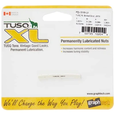 GraphTech Tusq XL ~ Man-Made Guitar Nuts Graphtech Tusq Xl Nut - St Style Left Handed Designed to boost guitar performance, TUSQ XL is precision engineered and specially formulated to bring out the hidden harmonics and richness in every note. TUSQ XL is based on the highly resonant TUSQ man made ivory and impregnated with PTFE, the slipperiest substance on earth, to improve the tuning performance of the guitar. Improved tuning stability, improved harmonic content