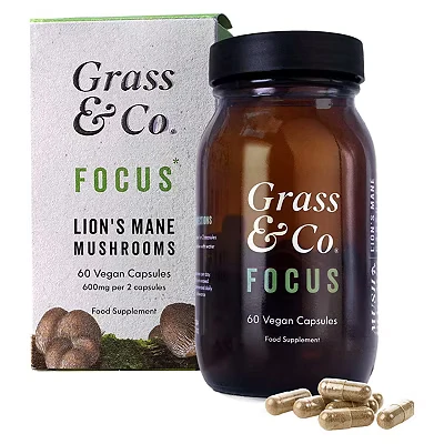 Grass & Co Focus Lion's Mane Mushroom Capsules Supports Cognitive Health 60 30 Servings Extract, Ginseng, Omega 3, Vitamins B12 D