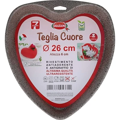 CONTENT - At home you will receive a heart-shaped cake mold, made of very durable aluminum and equipped with 7 layers of non-stick and scratch-resistant coating, diameter of 26 cm. Excellent heat transfer ensures uniform browning on the product during cooking. All Graziano baking molds are subject to the highest standards of quality and functionality, using only the best non-stick and anti-scratch coating materials. DURABLE - Our heart shaped tart mold is made of quality aluminum, durable and sturdy. Heat resistant and non-toxic, safe to use for you and your family. Designed for durability and longevity that will last you for a long time. A good helper to get the delicious bite of sweetness. NON-STICK - No matter whatever you are doing, the non-stick and scratch resistant coating of our heart-shaped tart mold allows you to escape food easily without the use of fat or oil, for a healthier cooking GRAZIANO - For forty years now, Graziano offers anyone their own experience and products to make delicious homemade desserts. Only from us you will find everything you need to prepare and create cakes and cakes. Choose from a wide selection of cake decorations, equipment and ingredients, food dyes, sugar paste and much more CUSTOMER SERVICE - With our safe and high quality products we help to meet the needs of our consumers. We always listen to our customers and consider their point of view to be able to offer better products. We are at your disposal 24/7 for any request, please feel free to contact us!