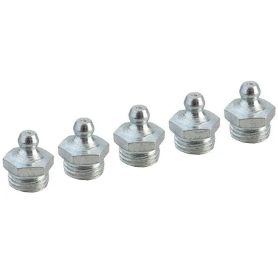 Faithfull straight grease nipples are case hardened and zinc plated for corrosion resistance. Conforming to DIN 71412, these 1/4in BSP nipples are supplied in packs of five and suit commercial and domestic lubrication applications. Case hardened and zinc plated for corrosion resistance. Conforms to DIN 71412 for standardized fit. Available in common thread sizes for easy replacement. Supplied in packs of five for convenient spares. Thread size: 1/4in BSP. Statutory manufacturer guarantee applies. New condition and ready for immediate use.