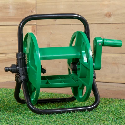 Keep your garden neat, organised, and tangle-free with this Portable Garden Hose Pipe Storage Reel with Crank Handle. Designed for convenience and durability, this practical hose reel is the perfect solution for storing and managing your garden hose, helping to extend its lifespan while keeping your outdoor space clutter-free.. Built with a strong black metal tubular frame, this hose reel offers excellent stability and long-lasting performance. The green plastic reel is lightweight yet durable, making it easy to handle while providing reliable support for your hose. Designed to accommodate any 30m x 13mm garden hose, it’s ideal for medium to large gardens, ensuring you have plenty of reach for watering, cleaning, and general outdoor tasks.. The integrated crank handle allows for smooth and effortless winding, so you can quickly store your hose after use without tangles or kinks. Its portable design makes it easy to move around your garden.. Product Specifications. Holds up to 30m x 13mm Hose Pipe