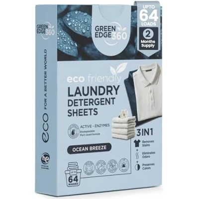 Green Edge 360 Laundry Detergent Sheets Eco Friendly, Plant Based Natural Washing for Up to 64 Loads Travel Hot and Cold Washes (64 (1 Pack), Ocean Breeze)