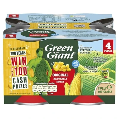 Green Giant Sweetcorn 4 x 198g features naturally sweet corn, harvested at perfect maturity and canned within 8–12 hours. Each can provides at least two servings; ingredients include sweet corn, water, and salt. It is one of your five-a-day and is suitable for recipes and salads.