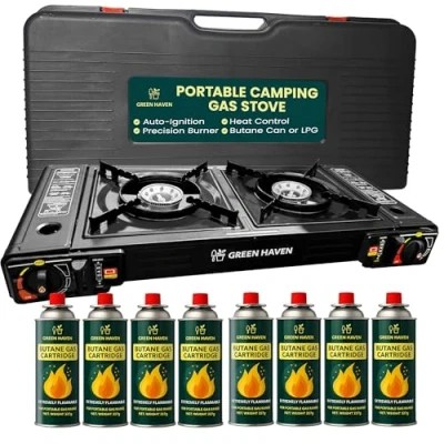 Green Haven Portable Camping Stove Double Burner Gas Cooker with Auto Ignition Compact Outdoor for Camping, BBQ & Cooking EN417 Compliant (STOVE + 8 GAS)
