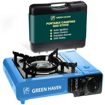 GREEN HAVEN Portable Camping Stove with Cary Case Premium Gas Stove, EN417 Compliant, Automatic Ignition & Heat Control, Blue
