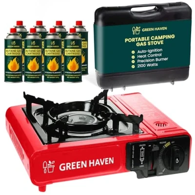 GREEN HAVEN Red Portable Camping Stove with Cary Case & 8 Butane Gas Premium Stove, EN417 Compliant, Automatic Ignition Heat Control