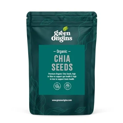 Pure raw chia seeds High in omega 3 and calcium Popular for baking, as a breakfast topping and adding to smoothies Find a recipe for Green Origins' Chia pudding on pack Certified Organic by the Soil Association and vegan by the Vegan Society *Note: Pack design may vary, but contents remain the same.