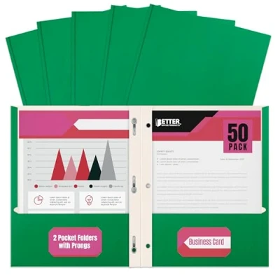 50-PACK: Green matte finish paper folders with 3.75" pockets and prongs. Easily holds 100 sheets (50/pocket) of letter size (8.5" x 11") paper/documents. But can even handle more. STURDY: Comes in a durable white box with color-coded label for easy identification; Bulk pack MULTI-USE: Can be used as a report cover for 3-hole punched paper and as a two-pocket folder BUSINESS USE: Two interior flat pockets each with die-cut business card slots VERSATILE: Great for school, home and office use