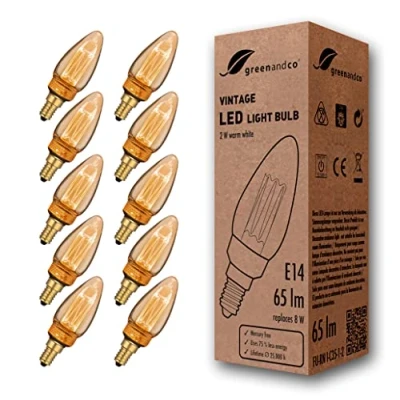 QUALITY: Experience the unique charm of a nostalgic light bulb with the efficiency and longevity of modern LED technology. The greenandco vintage-style LED bulb creates a cosy atmosphere and does not flicker, providing pleasant lighting. Ideal for cafés, bars, restaurants or your living room at home. Its retro look is particularly suitable for use in open luminaires, chandeliers or as a solo bulb. DESIGN: The laser-engraved acrylic glass cylinder inside the bulb creates an authentic filament effect. The outer glass bulb can be unscrewed to straighten the acrylic glass cylinder if necessary. AMBIENT LIGHTING: Due to the extra warm colour of the light and low luminosity, the light is similar to that of a candle. Therefore, the bulb is not suitable for room lighting. The dimensions correspond to those of a classic E14 candle bulb. NO ENERGY EFFICIENCY CLASS: This bulb does not have an energy efficiency class due to its colour value components in accordance with EU Regulation 2019/2015, as it is not considered a light source in accordance with Article 2, paragraph 1a. The colour value components are: x=0.5460; y=0.4111. Therefore, it is only intended for use as a decorative mood light bulb. PRODUCT SAFETY: The safety of our products is a top priority for us. greenandco bulbs comply with all relevant national and European standards and have been tested by independent institutes. We can send you the certificates and test reports upon request. greenandco LED bulbs do not contain mercury and do not emit UV radiation., Weight: 1.4550509292 Pounds, Manufacturer: FU-RN I-C35-1-2 10x