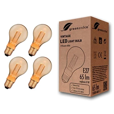 QUALITY: Experience the unique charm of a nostalgic light bulb with the efficiency and longevity of modern LED technology. The greenandco vintage-style LED bulb creates a cosy atmosphere and does not flicker, providing pleasant lighting. Ideal for cafés, bars, restaurants or your living room at home. Its retro look is particularly suitable for use in open luminaires, chandeliers or as a solo bulb. DESIGN: The laser-engraved acrylic glass cylinder inside the bulb creates an authentic filament effect. The outer glass bulb can be unscrewed to straighten the acrylic glass cylinder if necessary. AMBIENT LIGHTING: Due to the extra warm colour of the light and low brightness, the light is similar to that of a candle. Therefore, the bulb is not suitable for room lighting. The dimensions correspond to those of a classic E27 A60 bulb. NO ENERGY EFFICIENCY CLASS: This bulb does not have an energy efficiency class due to its colour value components in accordance with EU Regulation 2019/2015, as it is not considered a light source in accordance with Article 2, paragraph 1a. The colour value components are: x=0.5392; y=0.4089. Therefore, it is only intended for use as a decorative mood light bulb. PRODUCT SAFETY: The safety of our products is a top priority for us. greenandco bulbs comply with all relevant national and European standards and have been tested by independent institutes. We can send you the certificates and test reports upon request. greenandco LED bulbs do not contain mercury and do not emit UV radiation., Weight: 0.17 pounds, Manufacturer: FU-RN I-A60-1-2 4x