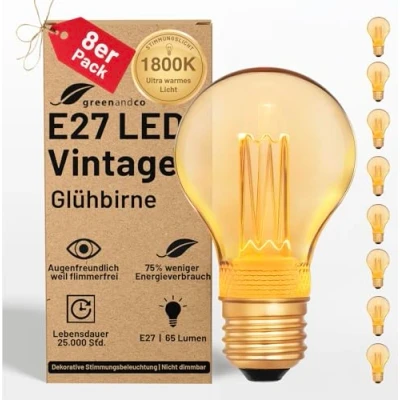 QUALITY: Experience the unique charm of a nostalgic light bulb with the efficiency and longevity of modern LED technology. The greenandco vintage-style LED bulb creates a cosy atmosphere and does not flicker, providing pleasant lighting. Ideal for cafés, bars, restaurants or your living room at home. Its retro look is particularly suitable for use in open luminaires, chandeliers or as a solo bulb. DESIGN: The laser-engraved acrylic glass cylinder inside the bulb creates an authentic filament effect. The outer glass bulb can be unscrewed to straighten the acrylic glass cylinder if necessary. AMBIENT LIGHTING: Due to the extra warm colour of the light and low brightness, the light is similar to that of a candle. Therefore, the bulb is not suitable for room lighting. The dimensions correspond to those of a classic E27 A60 bulb. NO ENERGY EFFICIENCY CLASS: This bulb does not have an energy efficiency class due to its colour value components in accordance with EU Regulation 2019/2015, as it is not considered a light source in accordance with Article 2, paragraph 1a. The colour value components are: x=0.5392; y=0.4089. Therefore, it is only intended for use as a decorative mood light bulb. PRODUCT SAFETY: The safety of our products is a top priority for us. greenandco bulbs comply with all relevant national and European standards and have been tested by independent institutes. We can send you the certificates and test reports upon request. greenandco LED bulbs do not contain mercury and do not emit UV radiation., Weight: 2.5132697868 Pounds, Manufacturer: FU-RN I-A60-1-2 8x