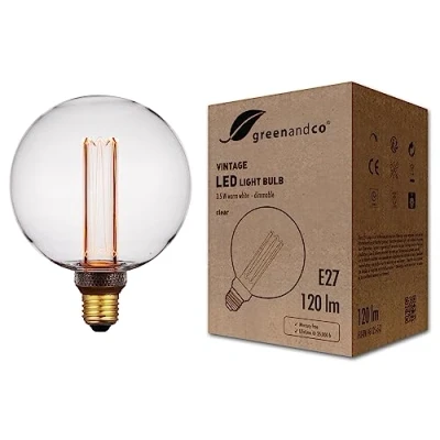 QUALITY: Experience the unique charm of a nostalgic light bulb with the efficiency and longevity of modern LED technology. The greenandco vintage-style LED bulb creates a cosy atmosphere and does not flicker, providing pleasant lighting. Ideal for cafés, bars, restaurants or your living room at home. Its retro look is particularly suitable for use in open luminaires, chandeliers or as a solo bulb. DESIGN: The laser-engraved acrylic glass cylinder inside the bulb creates an authentic filament effect. The outer glass bulb can be unscrewed to straighten the acrylic glass cylinder if necessary. AMBIENT LIGHTING: Due to the extra warm colour of the light and low brightness, the light is similar to that of a candle. Therefore, the bulb is not suitable for room lighting. Please note that the dimensions of the bulb are larger than those of a conventional bulb. NO ENERGY EFFICIENCY CLASS: This bulb does not have an energy efficiency class due to its colour value components in accordance with EU Regulation 2019/2015, as it is not considered a light source in accordance with Article 2, paragraph 1a. The colour value components are: x=0.5499; y=0.4080. Therefore, it is only intended for use as a decorative mood light bulb. PRODUCT SAFETY: The safety of our products is a top priority for us. greenandco bulbs comply with all relevant national and European standards and have been tested by independent institutes. We can send you the certificates and test reports upon request. greenandco LED bulbs do not contain mercury and do not emit UV radiation., Weight: 0.4850169764 Pounds, Manufacturer: FU-RN I-G125-cl-D