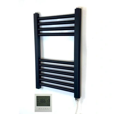 ManoManoGeneral description Its elegant shape with round cross tubes is simple yet modern, adding a touch of class to any style of bathroom. Designed to ensure plenty of slots to hang towels, it provides maximum heat output while being practical for use, sufficiently heating a bathroom. Technical specifications Dimensions: W400mm x H600mm Material: Low carbon steel Finish: Matt Black powder coat for maximum corrosion resistance Heating elements: CE certified European designed PTC heating elements Compatibility and accessories 7 day programmable timer Built-in room thermostat Usage The towel rail can be set to turn on and off at your convenience, with the ability to adjust the room temperature for maximum comfort. The controller also features a manual function for additional heat when needed, automatically switching on and off to maintain a constant temperature.