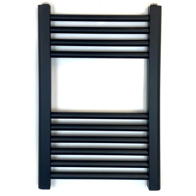 ManoManoGeneral description Manufactured from black powder coated steel, this central heating towel rail is designed for use in both domestic and commercial wet central heating systems. Its elegant shape with round cross tubes is simple yet modern, adding a touch of class to any style of bathroom. Designed to ensure plenty of slots to hang towels, it provides maximum heat output while remaining practical for use, making it sufficient to supply heat to a bathroom. Technical specifications Dimensions: W400mm x H600mm Material: Black powder coated steel Certification: EN442 and CE standards Guarantee: 5 years