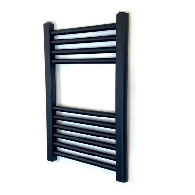 General description Manufactured from black powder coated steel, this central heating towel rail is designed for use in both domestic and commercial wet central heating systems. Its elegant shape with round cross tubes is simple yet modern, adding a touch of class to any style of bathroom. Designed to ensure plenty of slots to hang towels, it provides maximum heat output while remaining practical for use, making it sufficient to supply heat to a bathroom. Technical specifications Dimensions: W500mm x H600mm Material: Black powder coated steel Certification: EN442 and CE standards Guarantee: 5 years