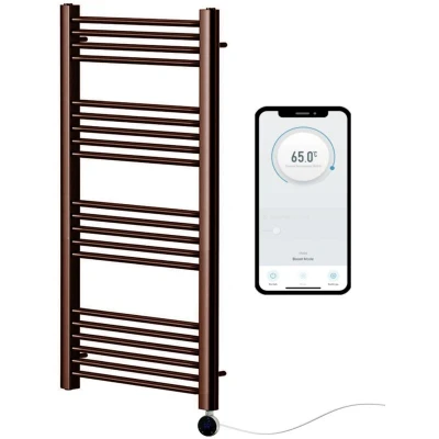 DESIGN - The bronze finish gives the rail a classic look that can complement a variety of bathroom styles. It also adds a luxurious feel to the space. A practical and decorative accessory that enhances your bathroom. SMART TECHNOLOGY - Manage your heating effortlessly from your smartphone with a free downloadable app available on iOS, Android and Google operating systems. Using the latest smart technology, you can turn the heating element on or off, adjust the temperature, and set schedules and use different heating modes from anywhere using a mobile app. 7 DAY SCHEDULING – optimise your energy use by setting time periods when you require your towel rail/radiator to be on. Multiple time periods can be selected each day. TECHNICAL INFORMATION – 500mm W x 1200mm H. CE, EN442 and UKCA certified. 500w WiFi controlled Element. 5 year guarantee on the towel rail, 2 year guarantee on the WiFi element covers manufacturing defects. 22mm cross tubes, distance from wall adjustable between 75mm to 90mm. WiFi Element can be placed on either the left or right hand side. Heater temperature range - 30-70 C. The element controls the temperature of the heater. NO HIDDEN EXTRAS - All our electric towel rails come pre-filled and are supplied with everything you need; 300 watt Wi-Fi heating element, adjustable wall brackets, wall fixing screws and wall plugs.