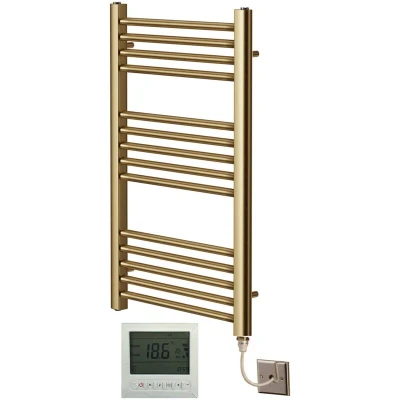 Greened House Electric Brushed Brass Straight Heated Towel Rail 500mm Wide x 800mm High Flat Radiator + Timer and Thermostat