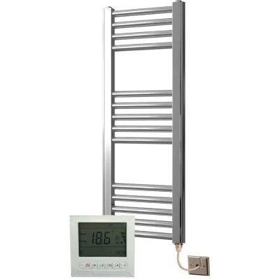 General description These chrome plated flat electric towel rails feature an energy-efficient PTC electric heating element, combining cost-effective operation with excellent handcrafted build quality. They are filled with a glycol solution to prevent freezing and corrosion, while also reducing noise compared to traditional towel warmers filled with water. The high specification IP64 rated CE approved PTC electrical element ensures a safe and stable temperature of 70°C, which can be adjusted with a dimmer switch. The element operates at full power until the desired temperature is reached, then reduces power to maintain efficiency. A bidex timer is included for customizable operation, allowing you to set specific times for the towel rail to turn on and off or to activate when the temperature drops below a certain level. This feature helps save energy by heating rooms only when needed. Technical specifications Material: Mild Steel Finish: Chrome plated Shape: Flat/Straight Heat Source: