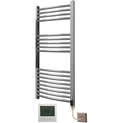 Greened House Electric Chrome 500W x 1000H Curved Towel Rail + Timer and Room Thermostat Bathroom Rails