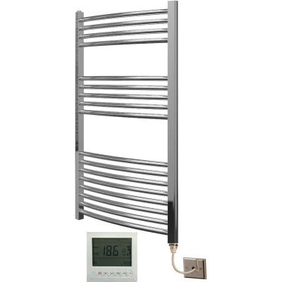 General description These chrome plated curved electric towel rails feature an energy-efficient PTC electric heating element, combining cost-effective operation with excellent handcrafted build quality. They are filled with a glycol solution to prevent freezing and corrosion, while also reducing noise compared to traditional towel warmers filled with water. Technical specifications Material: Mild Steel Finish: Chrome plated Shape: Curved Heat Source: Electric 220-240V 50Hz with 1m long power cord (requires hard wiring) Cross tube diameter: 22mm IP Rating: IP64 Certification: CE approved Dimensions: 600mm wide x 800mm high Heating Element Temperature: 70°C (can be reduced with a dimmer switch) Compatibility and accessories Includes a bidex timer for scheduling operation Fixings are included Installation Must be installed outside of the bathroom Requires connection via a switched 5amp fuse box by a qualified electrician Usage Allows for energy savings by heating rooms only when needed