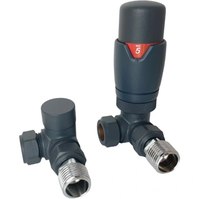 General description Kiev Anthracite corner valves are high-quality, industry-leading central heating valves made from powder-coated solid brass. They feature a polished mirror finish and are painted for maximum rust protection. These valves are perfect for any radiator or towel rail installation, enhancing the overall aesthetic of your space while eliminating unsightly pipework. Technical specifications Maximum working pressure: 13 bar Temperature settings: 5 (including frost protection) Pipe connections: 15mm - 1/2" BSP Bi-directional water flow Compatibility and accessories Suitable for towel rails Compatible with column radiators Works with panel central heating radiators Applicable for vertical flat tube radiators Installation Designed for installations where pipework comes out of the wall Usage The thermostatic TRV valve allows you to set the perfect temperature for your room, providing comfort and efficiency. Other information The valve set includes a TRV and lockshield valve,