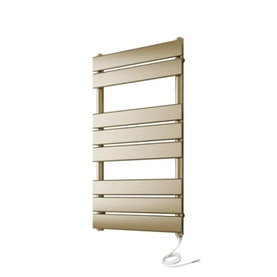 ManoManoGeneral description The Richmond Electric Heated Towel Rail in Brushed Brass features a sleek, flat tube design that provides ample space for warming towels while enhancing the aesthetic of any bathroom. It is a versatile addition suitable for both modern and traditional décor styles. The flat panel bars ensure superior heat distribution compared to standard round tube towel rails. Technical specifications Dimensions: 400mm W x 800mm H Depth: 100mm Heating Element: PTC Element with 1m cable (requires hard wiring) Material: Low carbon steel Brackets included IP64 rated for bathroom zone 2 38mm round tube CE & EN442 Certified 5-year guarantee on rail, 2-year guarantee on PTC heating element Element can be inserted into either side Other information Includes a bidex timer for scheduling operation Operates at full power until reaching 65°C, then reduces power to maintain temperature Designed for energy efficiency, reducing consumption compared to traditional electric rails Brackets and