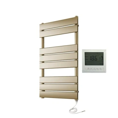 ⭐QUALITY FLAT TUBE DESIGN - The Richmond offers a sleek, flat tube design with amble space to warm your towels and the ability to enhance the look of any bathroom setting. A great addition to various décor styles, perfect for both modern and traditional bathrooms. The flat panel bars allow for extra heat distribution, far greater than a standard round tube towel rail. 🔋 ENERGY EFFICIENT - Our electric towel rails use the latest PTC heating elements which means that when the towel rail is up to working temperature the power used to keep the rail at the correct temperature can reduce by up to 30% so saving you money. 💎BRUSHED BRASS FINISH - The sleek brushed brass finish has a timeless appearance which adds a luxurious feel to any bathroom. Wall brackets are positioned on the uprights of the rail, maximising hanging space for your towels and keeping them organised and accessible. ✅ NO HIDDEN EXTRAS - All our towel rails are pre-filled and supplied with everything you need to fit the rail to the wall. It comes with a PTC heating element (can be fitted on either side of the rail) , wall brackets, wall fixing screws and wall plugs, blanking plug and air vent. 📋 TECHNICAL INFORMATION - 400mm W x 800mm H, 250w PTC heating element, Made from low carbon steel, 1m power cable, IP55 rated PTC element bathroom zone 2, 38mm round tube, CE & EN442 Certified, 5 year guarantee on the rail, 2 year guarantee on the element. ⏲️BE IN CONTROL - The towel rail is supplied with a 7 day programable timer and a built-in room thermostat. This means you can set the rail to come on and go off whenever you want and set the room temperature to ensure maximum comfort when you need it. The controller has a manual function for the times you want additional heat. Thanks to the controller it will automatically switch on and off to maintain this constant temperature.