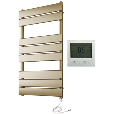 ManoManoGeneral description The Richmond Electric Heated Towel Rail in Brushed Brass features a sleek, flat tube design that provides ample space for warming towels while enhancing the aesthetic of any bathroom. This towel rail is a perfect addition to both modern and traditional bathroom styles, offering superior heat distribution compared to standard round tube towel rails. Technical specifications Dimensions: 400mm W x 800mm H Depth: 100mm Heating Element: PTC element with 1m cable (requires hard wiring) Material: Low carbon steel Brackets included IP64 rated for bathroom zone 2 38mm round tube CE & EN442 Certified 5-year guarantee on rail, 2-year guarantee on PTC heating element Brackets & air vent located on the back of the uprights Usage Operates at full power until reaching an operating temperature of 65°C, after which power is reduced to maintain temperature while saving energy. Includes a programmable timer that allows you to set specific times for the towel rail to switch on and