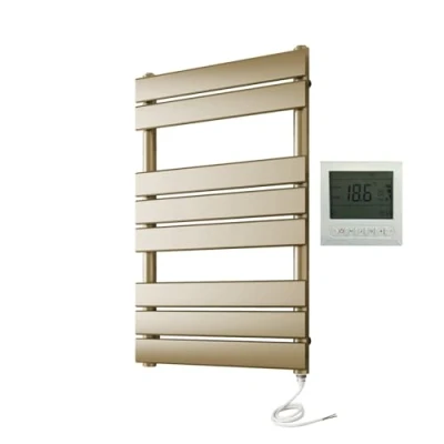 ⭐QUALITY FLAT TUBE DESIGN - The Richmond offers a sleek, flat tube design with amble space to warm your towels and the ability to enhance the look of any bathroom setting. A great addition to various décor styles, perfect for both modern and traditional bathrooms. The flat panel bars allow for extra heat distribution, far greater than a standard round tube towel rail. 🔋 ENERGY EFFICIENT - Our electric towel rails use the latest PTC heating elements which means that when the towel rail is up to working temperature the power used to keep the rail at the correct temperature can reduce by up to 30% so saving you money. 💎BRUSHED BRASS FINISH - The sleek brushed brass finish has a timeless appearance which adds a luxurious feel to any bathroom. Wall brackets are positioned on the uprights of the rail, maximising hanging space for your towels and keeping them organised and accessible. ✅ NO HIDDEN EXTRAS - All our towel rails are pre-filled and supplied with everything you need to fit the rail to the wall. It comes with a PTC heating element (can be fitted on either side of the rail) , wall brackets, wall fixing screws and wall plugs, blanking plug and air vent. 📋 TECHNICAL INFORMATION - 500mm W x 800mm H, 300w PTC heating element, Made from low carbon steel, 1m power cable, IP55 rated PTC element bathroom zone 2, 38mm round tube, CE & EN442 Certified, 5 year guarantee on the rail, 2 year guarantee on the element. ⏲️BE IN CONTROL - The towel rail is supplied with a 7 day programable timer and a built-in room thermostat. This means you can set the rail to come on and go off whenever you want and set the room temperature to ensure maximum comfort when you need it. The controller has a manual function for the times you want additional heat. Thanks to the controller it will automatically switch on and off to maintain this constant temperature.