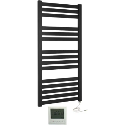 Greened House VAS 500 x 1165mm Designer Black Electric Towel Warmer Flat Panel Rail + Timer and Room Thermostat