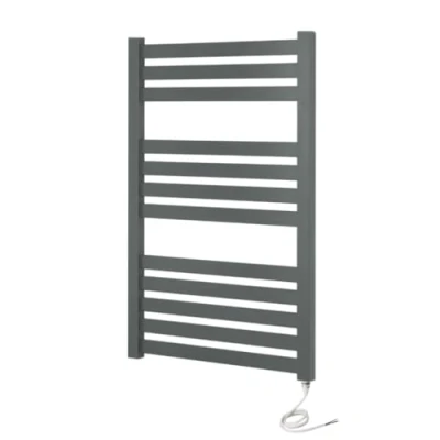 ManoManoGeneral description These luxury anthracite towel rails are powder coated for a modern finish. The wall brackets and air vent are mounted on the uprights, resulting in a sleek look and maximum space for hanging towels. Technical specifications Dimensions: 500 x 960 mm Finish: Anthracite Voltage: 220-240V Frequency: 50Hz Heat Output: 1024 BTU PTC Element Power: 300 W 10 year guarantee EN442 Certified CE Certified Wall brackets included Brackets & air vent located on the back of the uprights Usage The electric rails use a PTC heating element, which is made of ceramic stones designed to heat up to a defined temperature of 65°C and maintain this temperature by reducing the electric current. This means that the rail will initially heat up using the maximum rated wattage and then automatically reduce power while maintaining the temperature, making it more cost-effective to run compared to conventional heating elements.