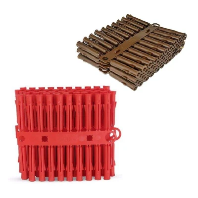 General description These quality wall plugs come in packs of 96 with a choice of two sizes: Brown 7 x 42mm or Red 5.5 x 34mm. The plugs are supplied in strips of 24, making them easy to store and find in your toolbox or bag. Technical specifications Pack size: 96 Brown size: 7 x 42mm Red size: 5.5 x 34mm Usage The wall plug is designed to expand at the neck, providing instant grip and opening wide inside the hole to ensure a strong and reliable fixing.