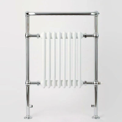 Our electric traditional column towel radiator is the perfect addition to any traditionally-styled bathroom, ensuite or cloakroom. It combines a column radiator, designed to provide ample heat to the room, with a towel warmer. Finished in white powder coating and chrome plating, it is made from steel for a tough and durable finish and secures to both the floor and wall. The Windsor electric towel radiator is suitable for any domestic or commercial environment and is perfect for when you can't connect a towel rail to your central heating or you want to be able to use your towel warmer throughout the year. It uses a ceramic PTC heating element which is designed to heat to 65°C, and regulates its power consumption to maintain this temperature. As a result, PTC elements are more cost effective to run than traditional resistance wire elements, and they can be used without a thermostat. Also Included is our 7 day programmable timer and thermostat which allows you to set up to three time
