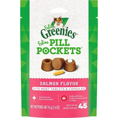 Easy to use pill pouches: Just put the pill or capsule of your cat’s medicine inside the moldable pocket, pinch closed until the pill is hidden, and share with your adult cat for a hassle-free treatment experience Delicious salmon flavor helps mask the taste of the medicine Feline Greenies Pill Pockets Cat Treats are the #1 vet recommended choice for giving pills* Made with all natural, real ingredients plus minerals and trace nutrients, with no artificial flavors, artificial preservatives, or fillers, so you can feel good about treating your pet daily with their routine medication Convenient Feline Greenies Pill Pockets Treats are a great-tasting treat for adult cats