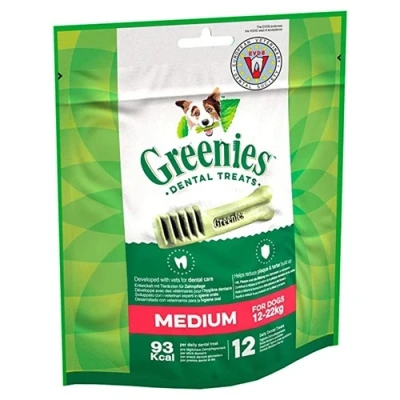 GREENIES Daily Dog Dental Treats have a unique, delightfully chewy texture that helps reduce plaque and tartar build-up while freshening breath. 100% nutritionally complete and made with soluble ingredients that easily break down for safe and easy digestion. The European Veterinary Dental Society (EVDS) endorses the Veterinary Oral Heath Care (VOHC) seal of acceptance. Original Petite Dog Dental Treats 85g Made for dog sizes 8-11kg 57 calories per daily dental treat Pack contents: 5 chews Original Medium Dog Dental Treats 85g Made for dog sizes 12-22kg 93 calories per daily dental treat Pack contents: 3 chews Original Petite Dog Dental Treats 340g Made for dog sizes 8-11kg 57 calories per daily dental treat Pack contents: 20 chews Original Medium Dog Dental Treats 340g Made for dog sizes 8-11kg 93 calories per daily dental treat Pack contents: 12 chews Feeding Guide: Not suitable for puppies under 6 months. Ensure the product is chewed adequately. Use within 4 weeks of opening. Fresh drinking water should always be available.