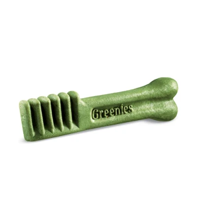 • Greenies LARGE size dog treats offer the most appropriate sized healthy dog chews for dog sizes 23kg+. Greenies dental chews large; a daily dog treat in a bag. • GREENIES™ Large original dog dental treats are made with natural ingredients, with a unique chewy texture that helps reduce plaque and tartar build up while freshening breath. Available in a handy dog treat pouch. • Greenies natural dog treats have been developed with vets for dental care, and contain no artificial colours or flavours • Greenies dog treats are 100% nutritionally complete and made with soluble ingredients that easily break down for safe and easy digestion. Greenies dental chews provide a healthy, daily dog treat. • Greenies Large dog treats are 150 calories per daily dental chew; available in convenient dog treat bags of varying sizes. GREENIES Large Daily Dog Dental Treats 170g encourage great dental health. Each dog treat bag has 4 chews made with natural ingredients for dog sizes 23kg+, designed to help keep your dog's teeth clean and promote fresh breath. Nutrition: Analytical constituents (%): Protein: 34.0, Fat content: 6.0, Inorganic matter: 6.0, Crude fibre: 4.0, Energy: 319 kcal/100 g, Additives per kg: , Nutritional additives: , Vitamin A: 8950 IU, Vitamin D3: 1510 IU, Copper (Copper(II) chelate of amino acids hydrate): 14.3 mg, Iodine (Potassium iodide): 2.2 mg, Iron (Iron(II) chelate of amino acids hydrate): 132 mg, Manganese (Manganese chelate of amino acids hydrate): 19.0 mg, Zinc (Zinc chelate of amino acids hydrate): 143 mg Preparation and Usage: Feeding instructions: For dogs over 23 kg, feed 1 Greenies™ Large chew per day. Not suitable for dogs under 23 kg or puppies under the age of 6 months. Be sure to select the correct size of Greenies™ for your dog. Please observe your dog while it is chewing, to ensure that the dog comfortably swallows it. Use within 4 weeks of opening. Fresh drinking water should always be available. Ingredients: Cereals (including Wheat Flour* 4%), Derivatives of Vegetable Origin (including Turmeric Extract* 0.1%), Meat and Animal Derivatives, Minerals, Yeasts, Fruit (including Dried Watermelon Juice* 0.16%, equivalent to Watermelon Juice 1.3% and Dried Huito Juice* 0.02%, equivalent to Huito Juice 0.16%) Various Sugars, Oils and Fats, *Natural Ingredients GREENIES are the original tastydailydog dental treatcreated by two pet parents trying to keep their dog's teeth clean and breath fresh. Today, GREENIES originaldog treatrecipe has been further developed by vets to create the ultimate smartdental dogtreats andis still on a mission to clean every mouth from top to bottom.