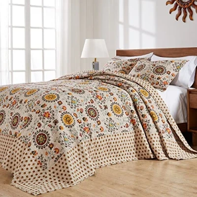 100% COTTON face, back and fill WHAT'S INCLUDED: Each set comes with one bedspread and two pillow shams. DIMENSIONS: 3-Piece Queen size set comes with one bedspread measuring 110 x 118 inches plus two standard pillow shams measuring 20 x 26 inches each (all dimensions +/- 2 inches) SAFETY TESTED and certified by OEKO-TEX Standard 100: WSI Certificate # 20.HCN.11993. Tested to be free of 350+ harmful chemicals and substances – keeping you and your loved ones safe from these threats with our products.