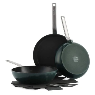 AmazonSet Includes: 24 cm frying pan, 28 cm frying pan, 28 cm wok GreenPan’s Thermolon healthy ceramic non-stick coating is free of PFAS, so it won’t release toxic fumes, even if it’s accidentally overheated Metal utensil safe, our original diamond-infused non-stick coating offers remarkable durability, balanced heating, and effortless cleaning Unique packaging design reduces size by 60% Magneto induction bases bring incredible searing and browning to all hobs, including induction The tough hard anodized bodies are scratch-resistant and designed to stand up to daily demands Oven safe up to 315°C Stainless steel handles offer an ergonomic grip and ship detatched to reduce carbon emissions Dishwasher safe for easy cleaning Suitable for all hobs, including induction
