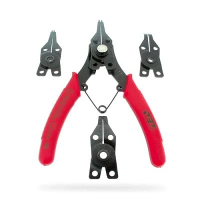 Internal and external circlip pliers. Comes with 4 sets of straight and angled tips