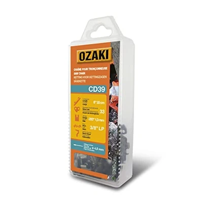 OZAKI chainsaw chain under semi-square shell: .3/8 inch LP .050 (1.3 mm) 33 drives (E33). Flower models: FEAS 6020T pruner – RYOBI: RPP680, RPP720 – STERWINS: 720PS-2, ECS2-35.3, EPS2-20.3, 36PSLI-2 – TCK: EBE850, Manufacturer: Greenstar
